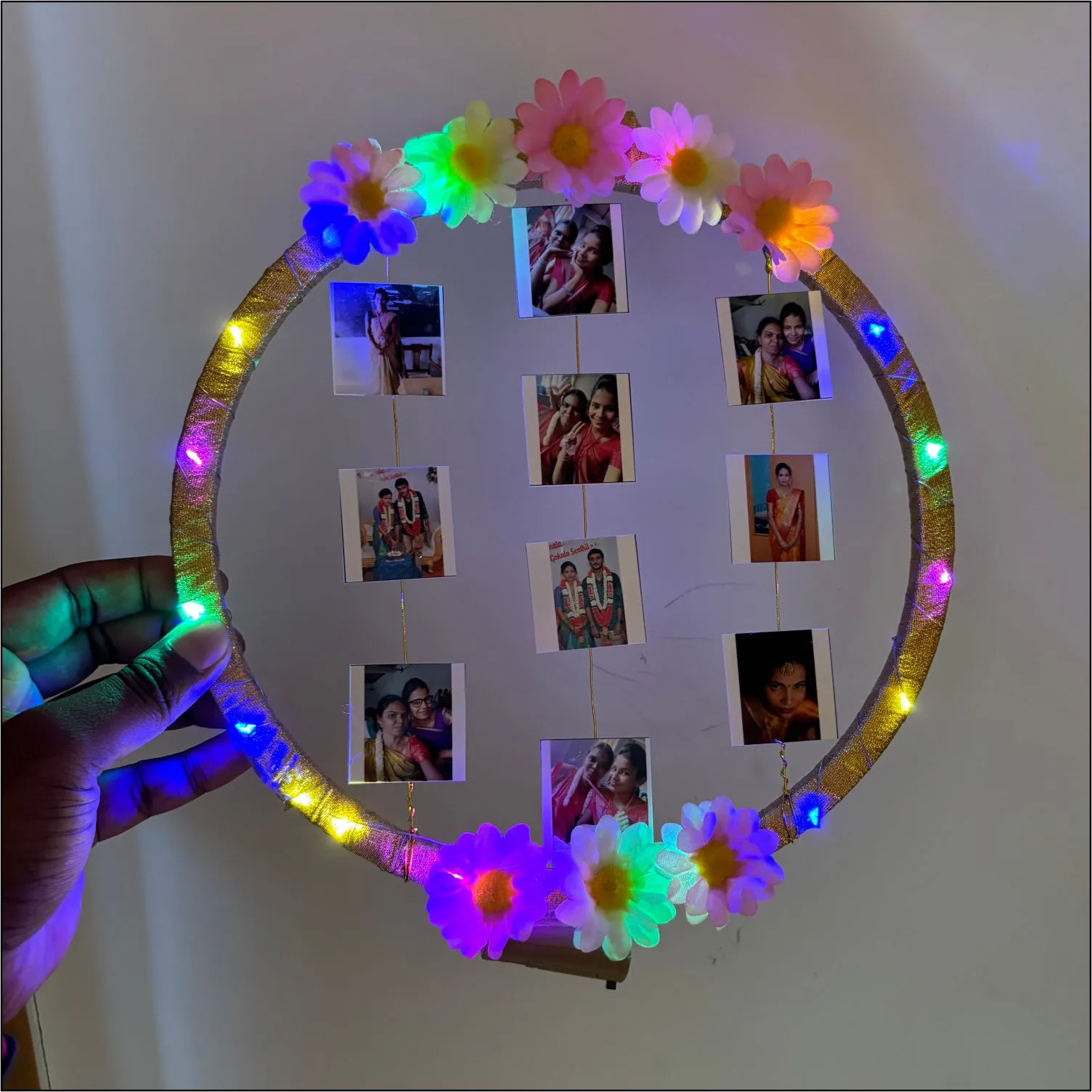 Create a magical display of your cherished moments with our beautiful LED Hoop. This unique gift combines creativity and technology, featuring vibrant multicolor LED lights that add a warm and enchanting glow to your favorite photos.
